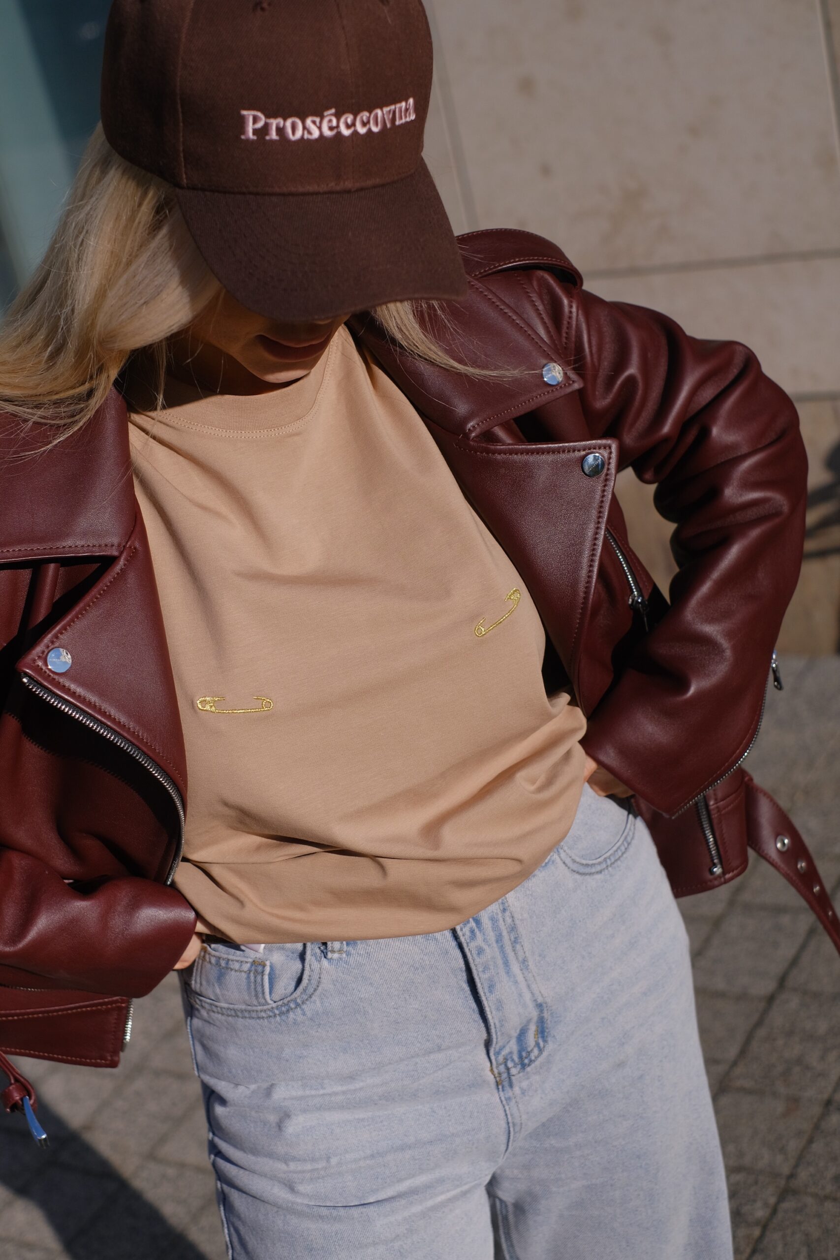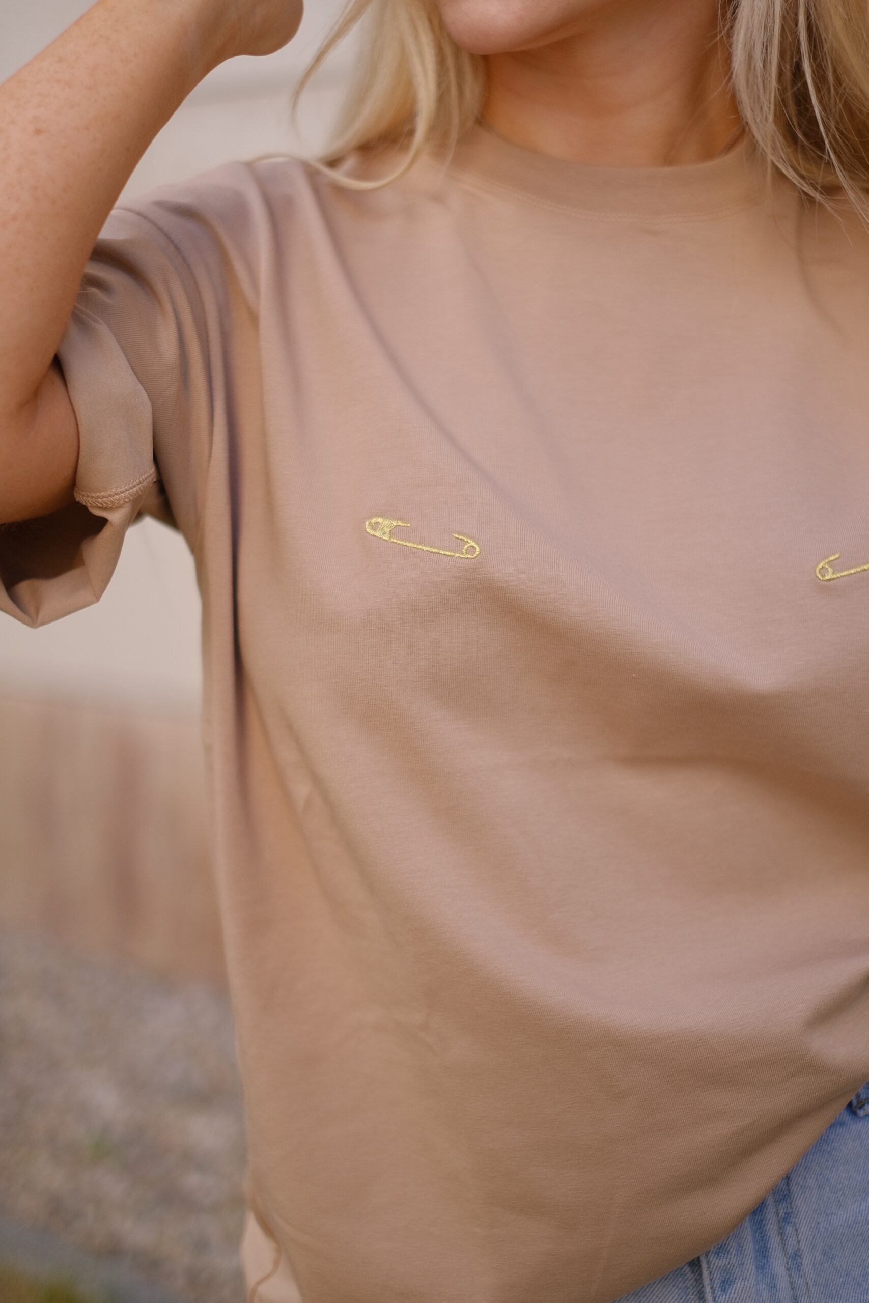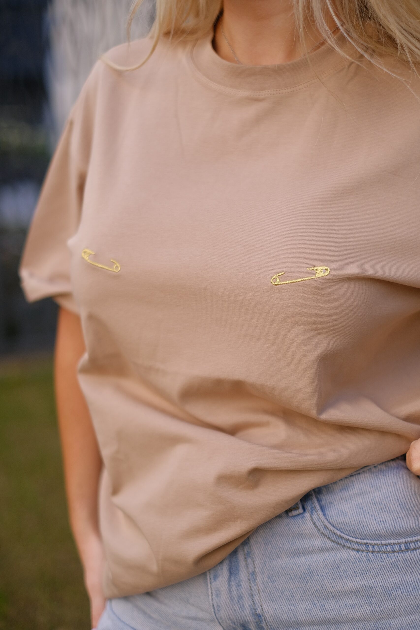 Футболка с правильным акцентом: золотая вышивка смотрится на десять из десяти и определяет весь образ.