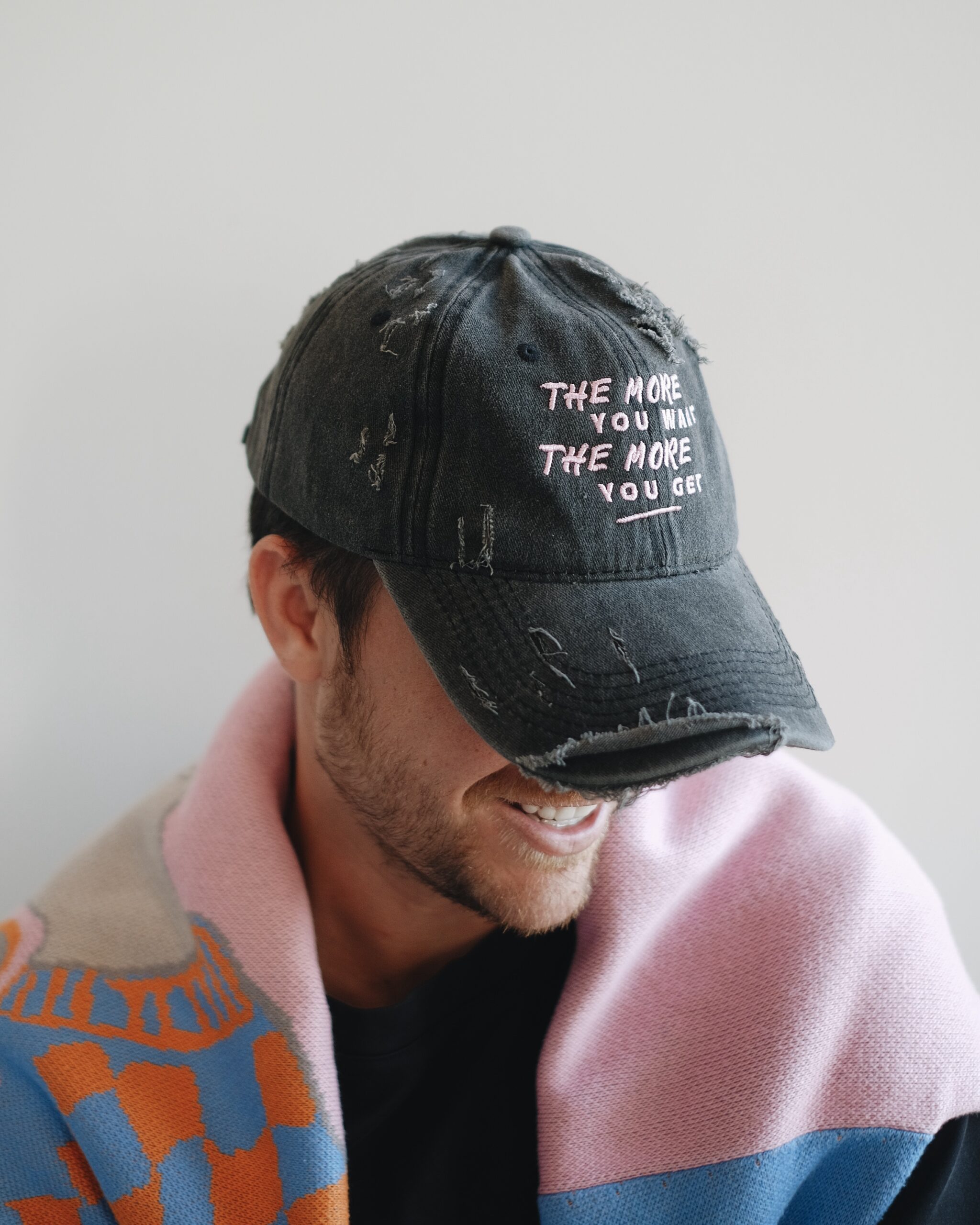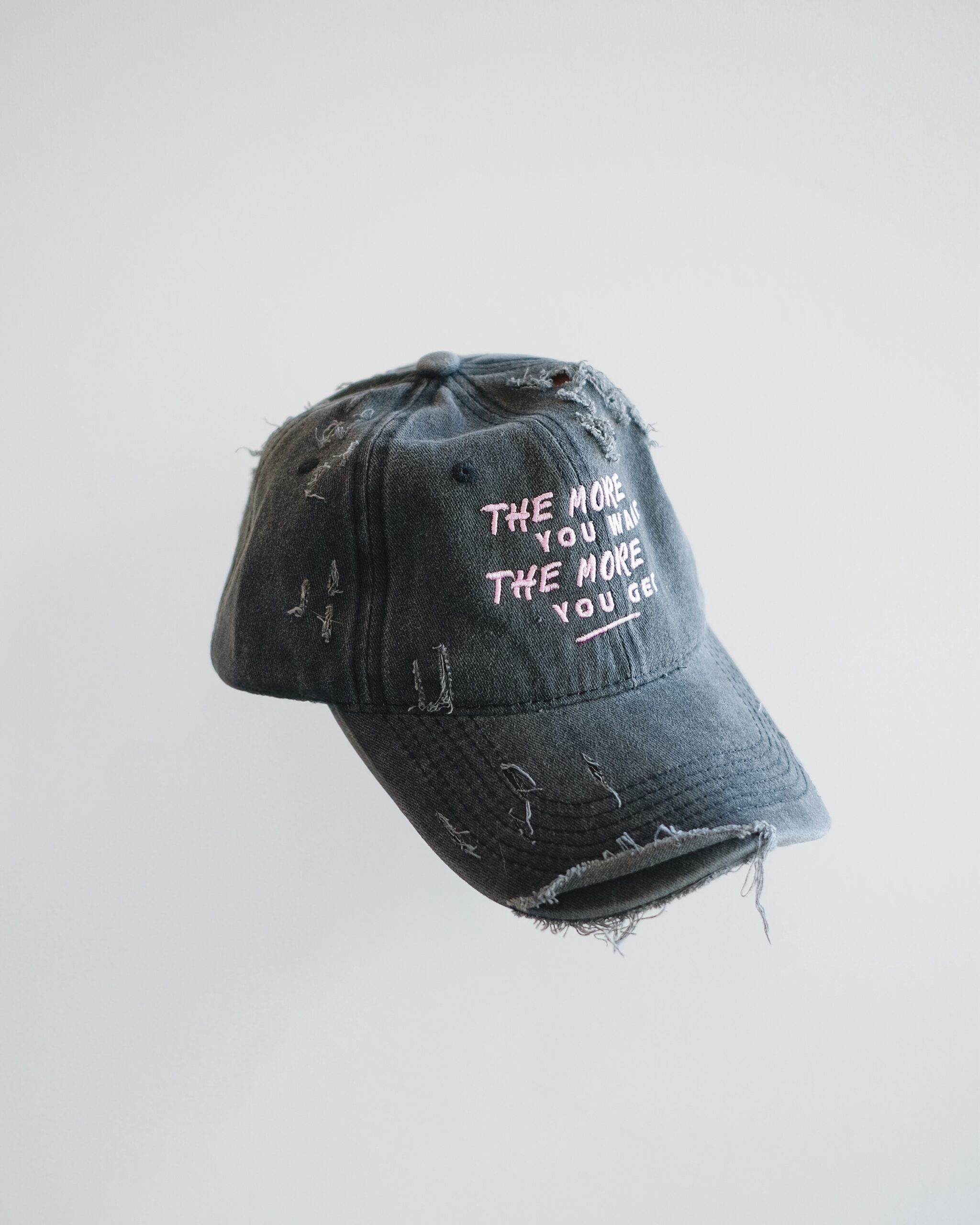 Рваная серая кепка «The more you want — the more you get»